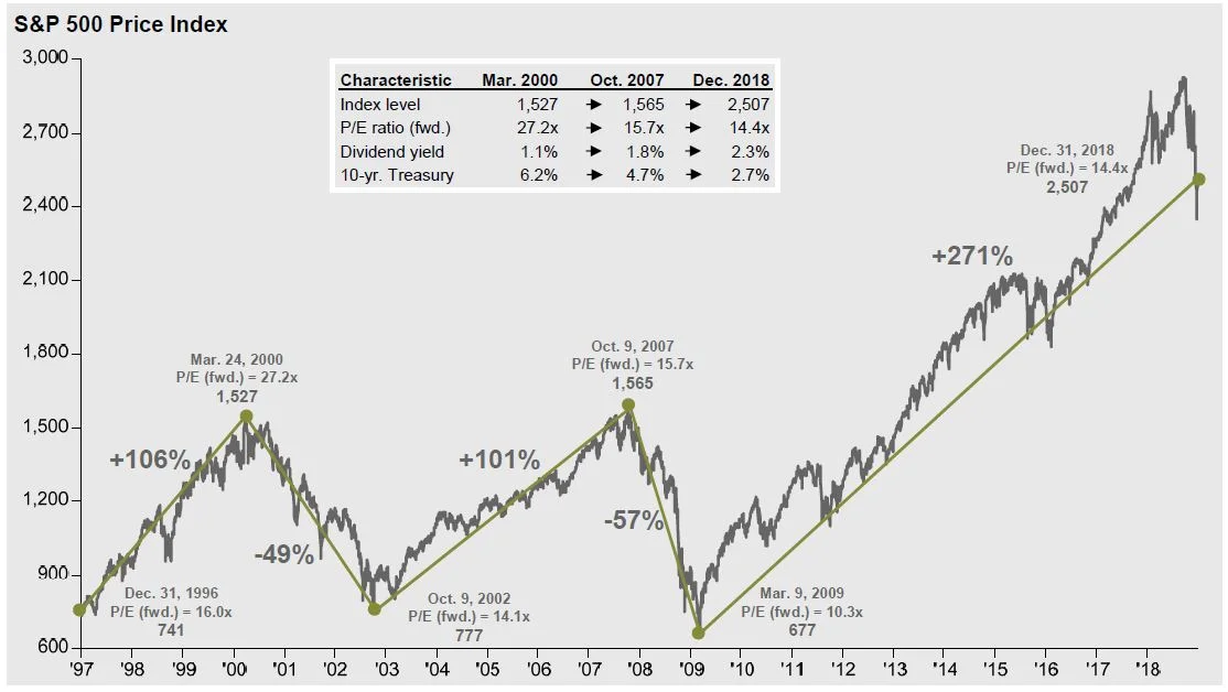 As this chart from JP Morgan shows, the S&P 500 Index (Which is a collection of the 500 largest US companies) has three periods of growth over the last twenty years: from ’97-’00, ’02-’08, and ’09-today and two bear markets (which is defined as a market correction of 20% or more). As a retiree, the thought of losing 49% or 57% of your retirement balance would be unbearable. Since most retirements are lasting twenty years or more, retirees should expect to see several market fluctuations over the course of their retirement. On average, 5% market corrections occur every 10 weeks, 10% corrections occur every 33 weeks and 20% corrections occur every 127 weeks*.